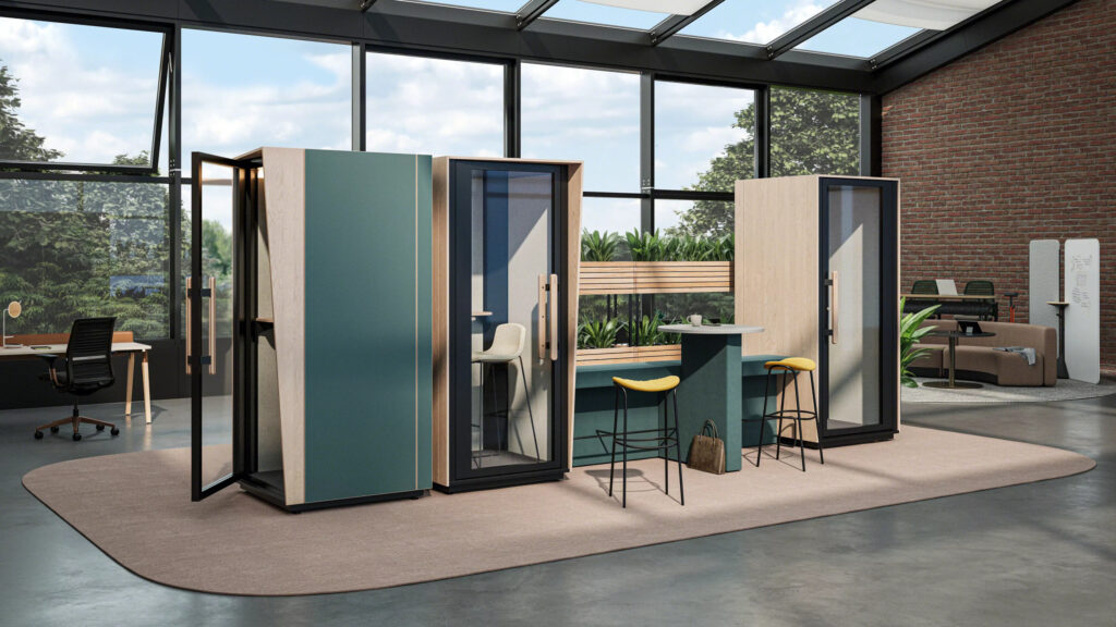 Thanks to high-quality acoustic materials, a sound-insulating glass door, and an intelligent ventilation system, it creates a comfortable, distraction-free environment for productive conversations. Soft, glare-free LED lighting, integrated power outlets and USB ports, and a height-adjustable work surface ensure comfort and optimal connectivity – a practical solution for modern, dynamic workplaces.