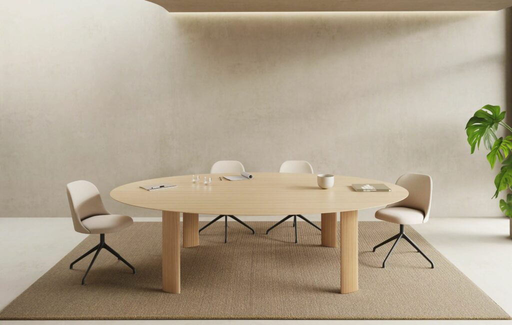La table associe esthétique naturelle et efficacité fonctionnelle – idéale pour les salles de réunion, les zones de travail ouvertes et les espaces d’accueil représentatifs.